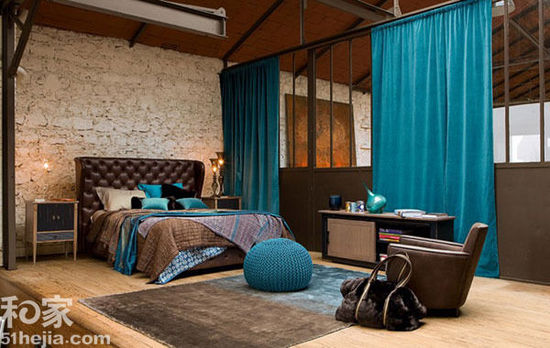 小編認(rèn)為:鐵皮裝飾著半面墻,另一邊同樣采用了懷舊的樣式,凹凸不平的墻面上嵌著一塊照片墻,很好的詮釋著后現(xiàn)代風(fēng)格。但是藍(lán)色的現(xiàn)代風(fēng)床和茶幾都帶來了很強(qiáng)的視覺刺激感,現(xiàn)代和懷舊的完美融合。